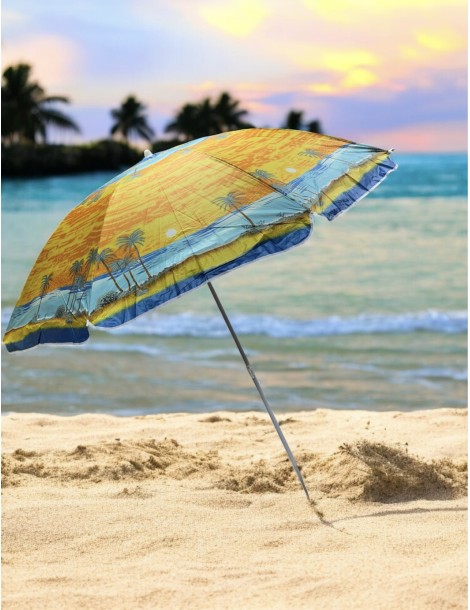 Este quitasol cuenta con una tela que ofrece protección UPF+40, ideal para protegerte de los rayos UV. Sus medidas son de 1,95x1,70cm, proporcionando una amplia zona de sombra