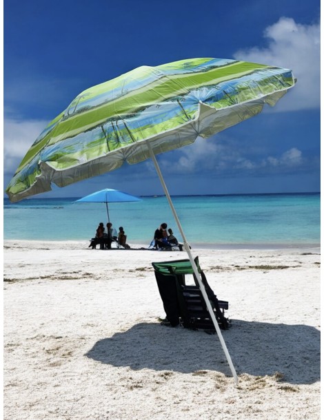 Este quitasol cuenta con una tela que ofrece protección UPF+40, ideal para protegerte de los rayos UV. Sus medidas son de 1,95x1,70cm proporcionando una amplia zona de sombra
